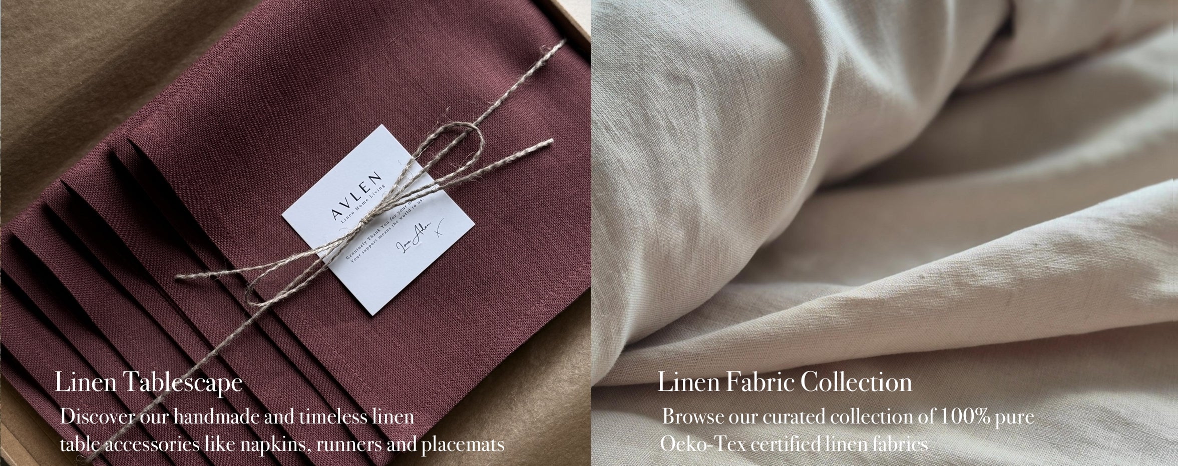 Welcome to Avlen - A thoughtfully curated collection of natural, beautifully crafted home pieces, designed to create spaces that feel wonderful to live in. At the heart of what we do is a passion for sustainable living, expressed through timeless design, natural materials and calming earthy tones. We specialise in made-to-measure Curtains and Roman blinds and offer a collection of over 50 mindfully sourced, 100% pure linen fabrics. Each item is carefully handmade in England, by us, for you.
